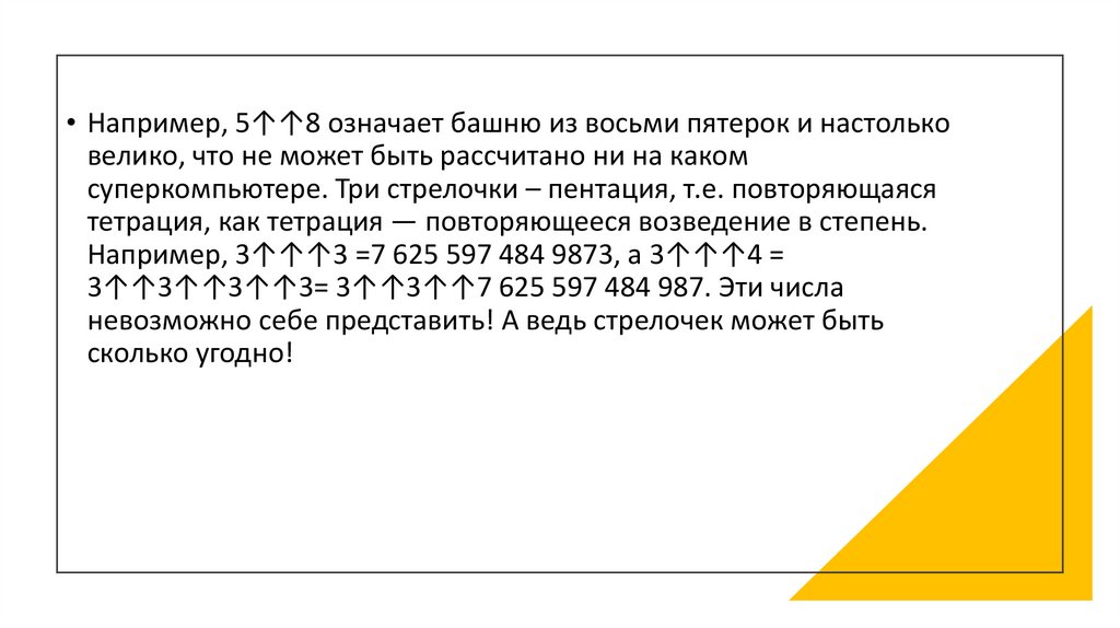 • Например, 5↑↑8 означает башню из восьми пятерок и настольковелико, что не может быть рассчитано ни на каком