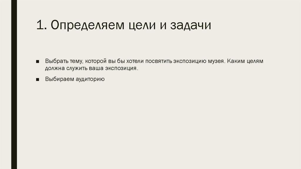 1. Определяем цели и задачи■ Выбрать тему, которой вы бы хотели посвятить экспозицию музея. Каким целям