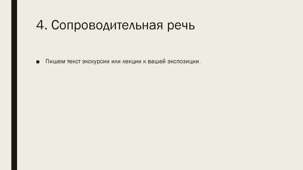 4. Сопроводительная речь■ Пишем текст экскурсии или лекции к вашей экспозиции.