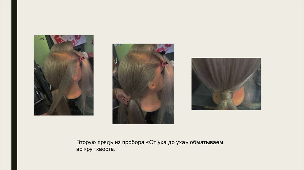 Вторую прядь из пробора «От уха до уха» обматываемво круг хвоста.