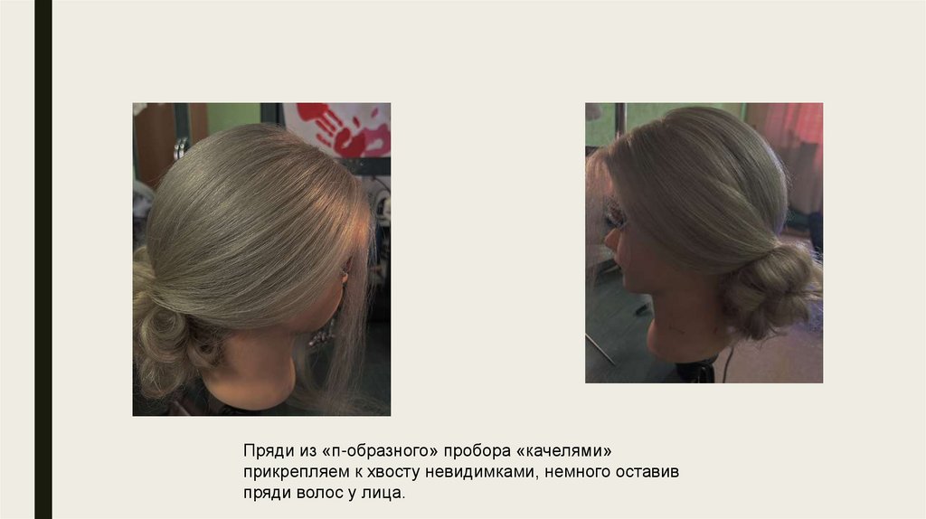 Пряди из «п-образного» пробора «качелями»прикрепляем к хвосту невидимками, немного оставив