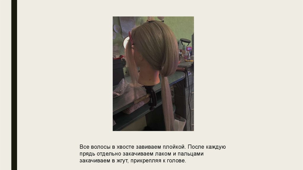 Все волосы в хвосте завиваем плойкой. После каждуюпрядь отдельно закачиваем лаком и пальцами