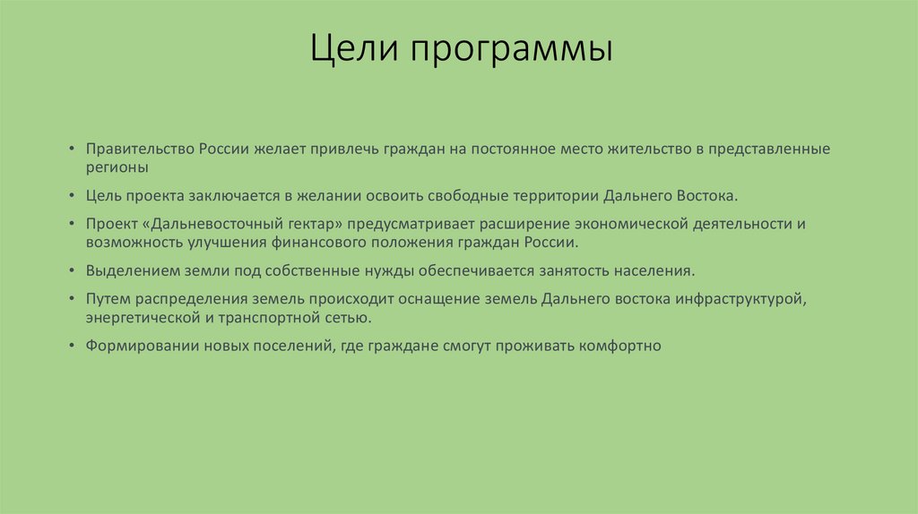 • Цель проекта заключается в желании освоить свободные территории Дальнего Востока.