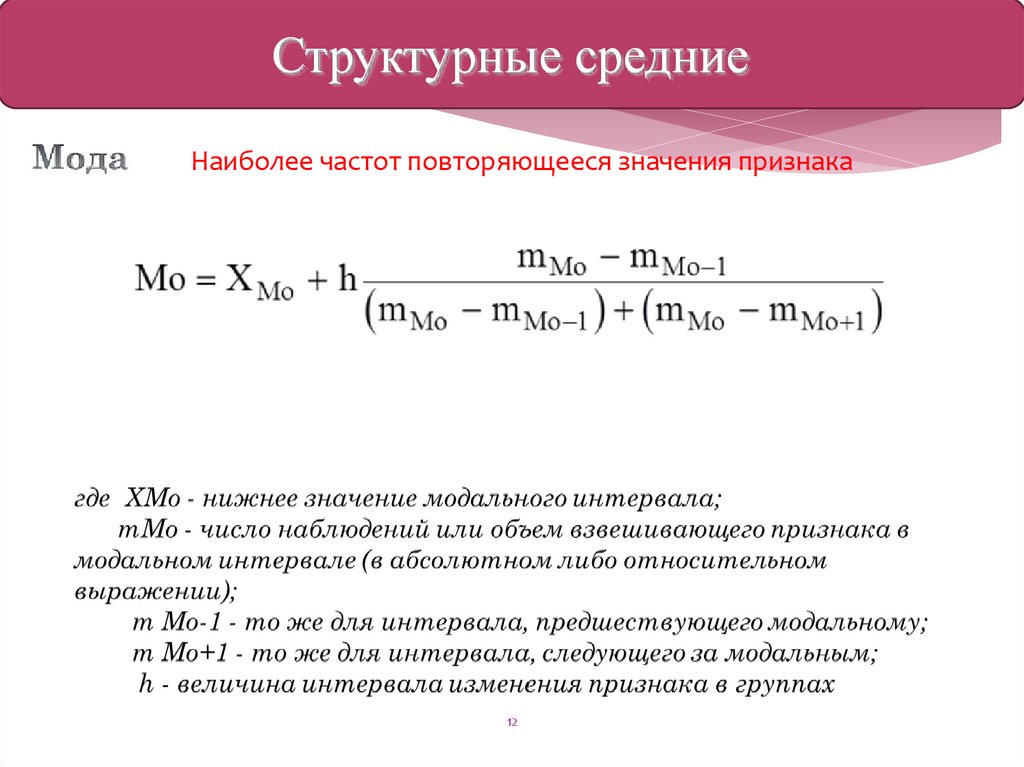 Структурные средниеНаиболее частот повторяющееся значения признака