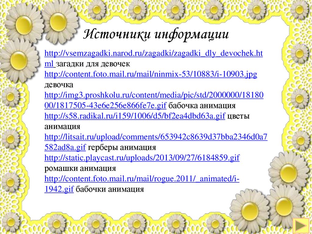 Источники информацииhttp://vsemzagadki.narod.ru/zagadki/zagadki_dly_devochek.ht