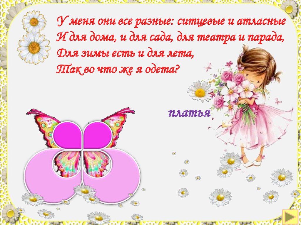 У меня они все разные: ситцевые и атласныеИ для дома, и для сада, для театра и парада,