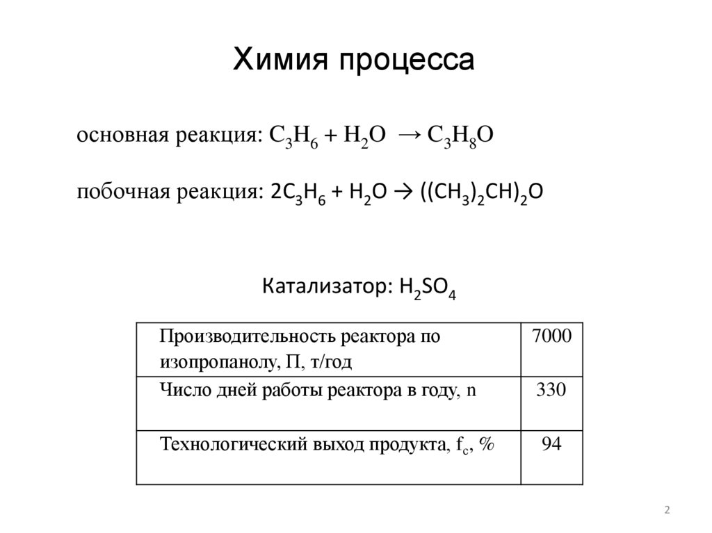 Химия процессаосновная реакция: C3H6 + H2O → C3H8O