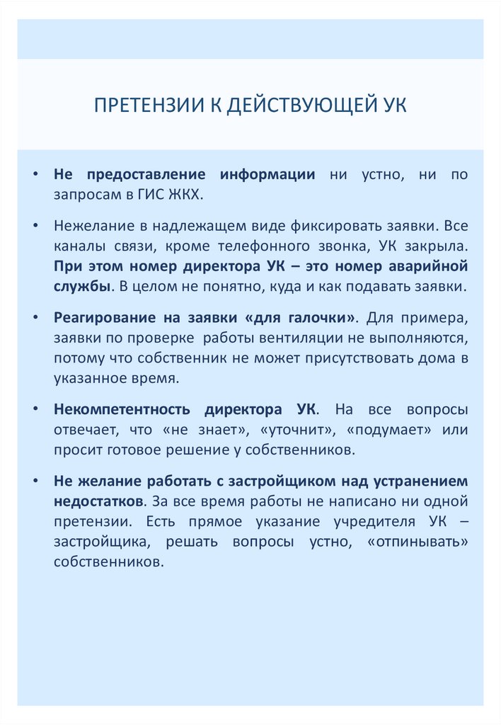 ПРЕТЕНЗИИ К ДЕЙСТВУЮЩЕЙ УК• Не предоставление информации ни устно, ни по
