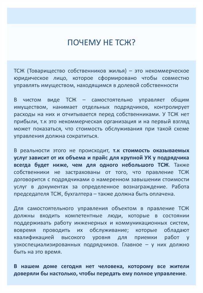 ПОЧЕМУ НЕ ТСЖ?ТСЖ (Товарищество собственников жилья) – это некоммерческое