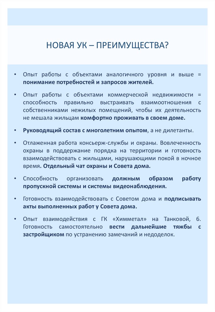 НОВАЯ УК – ПРЕИМУЩЕСТВА?Опыт работы с объектами аналогичного уровня и выше =