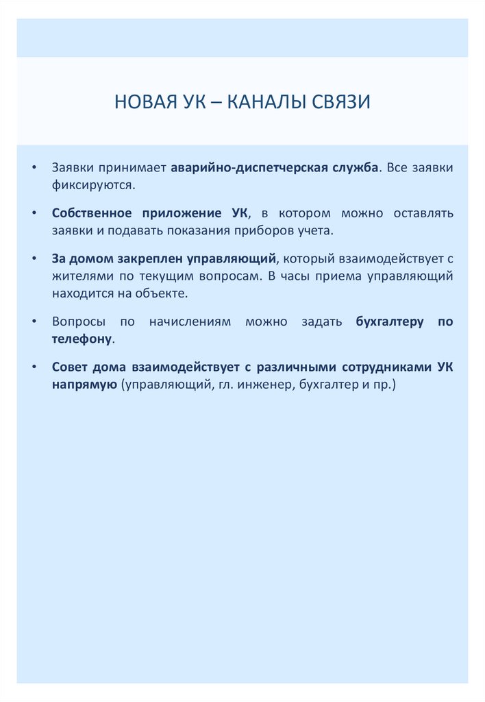 НОВАЯ УК – КАНАЛЫ СВЯЗИЗаявки принимает аварийно-диспетчерская служба. Все заявки