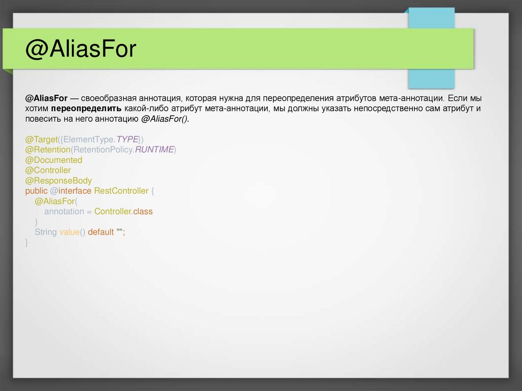 @AliasFor@AliasFor — своеобразная аннотация, которая нужна для переопределения атрибутов мета-аннотации. Если мы