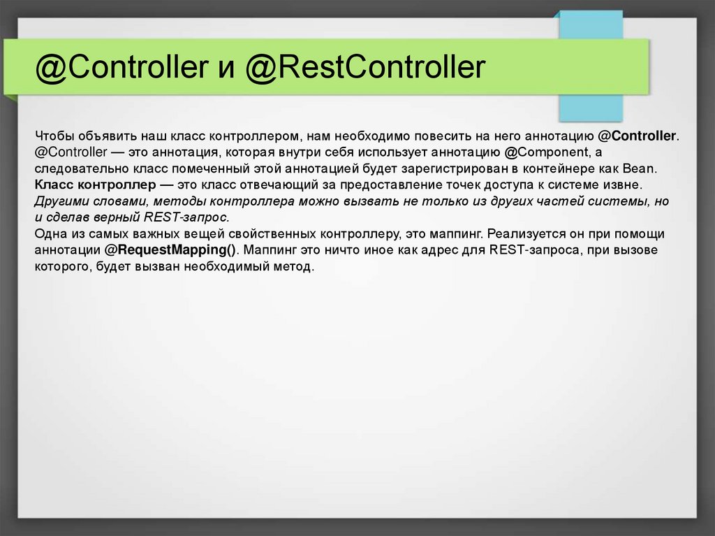 @Controller и @RestControllerЧтобы объявить наш класс контроллером, нам необходимо повесить на него аннотацию @Controller.