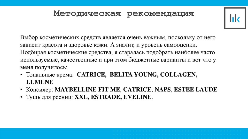 Методическая рекомендацияВыбор косметических средств является очень важным, поскольку от него