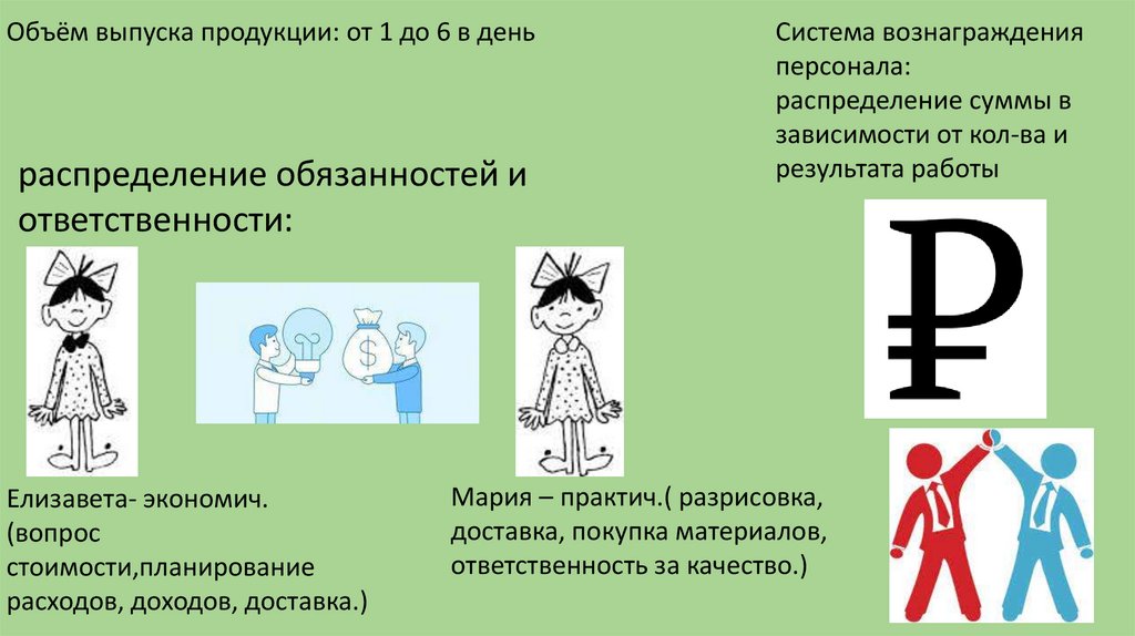 Объём выпуска продукции: от 1 до 6 в деньраспределение обязанностей и