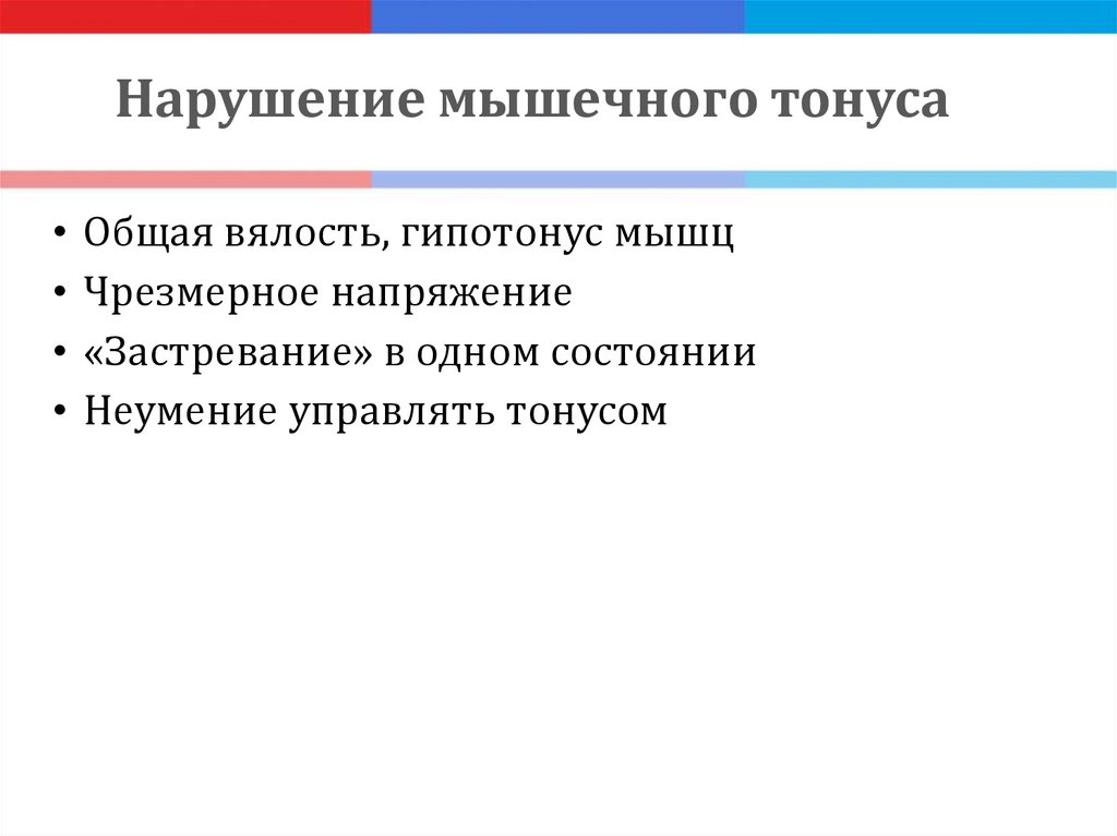 Нарушение мышечного тонуса• Общая вялость, гипотонус мышц