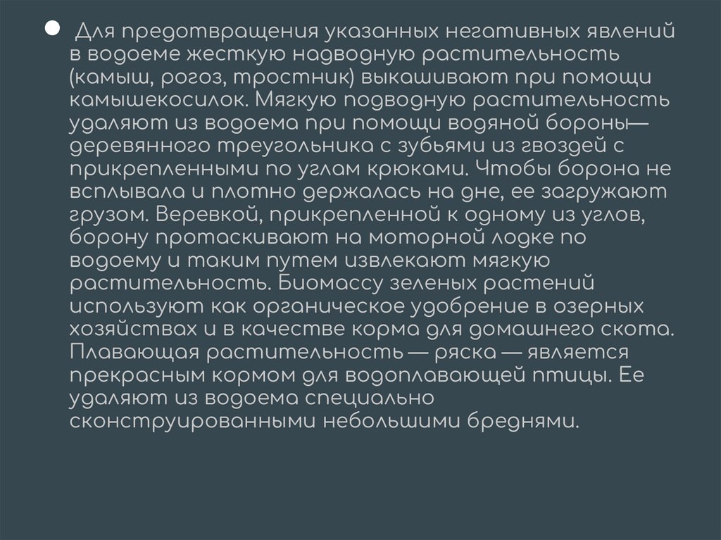 ● Для предотвращения указанных негативных явленийв водоеме жесткую надводную растительность