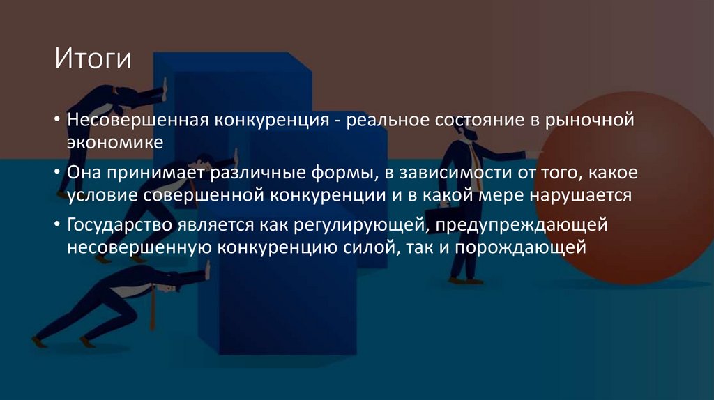 Итоги• Несовершенная конкуренция - реальное состояние в рыночной
