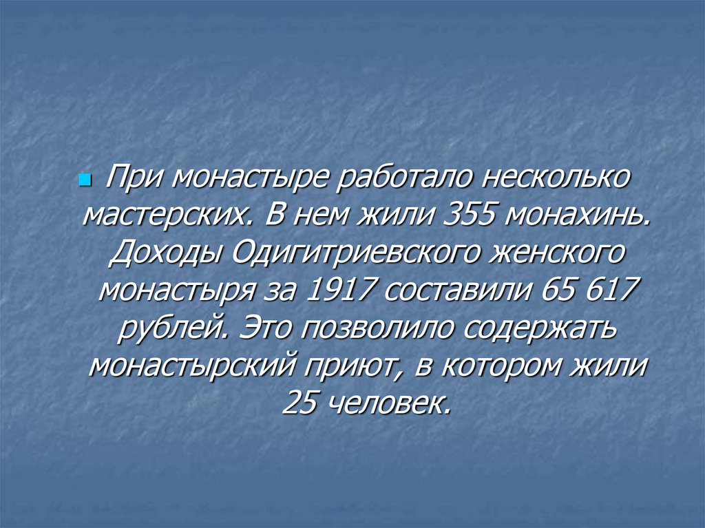 При монастыре работало несколькомастерских. В нем жили 355 монахинь.
