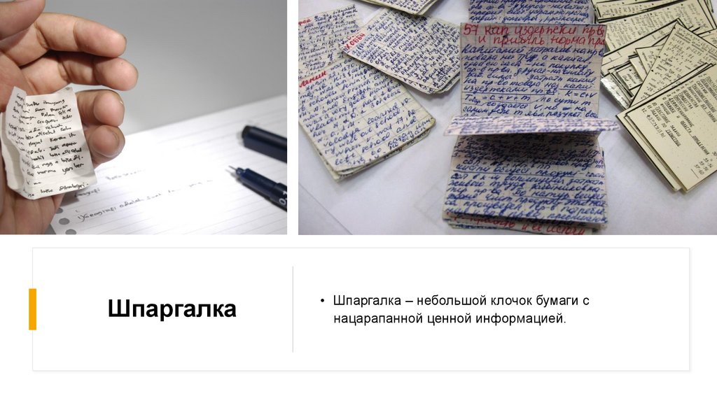 Шпаргалка• Шпаргалка – небольшой клочок бумаги с