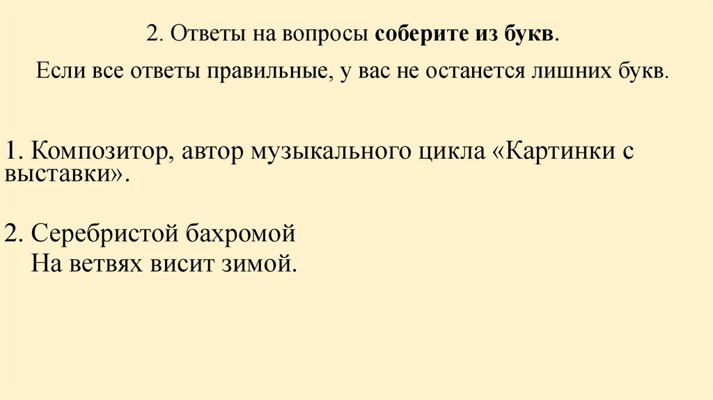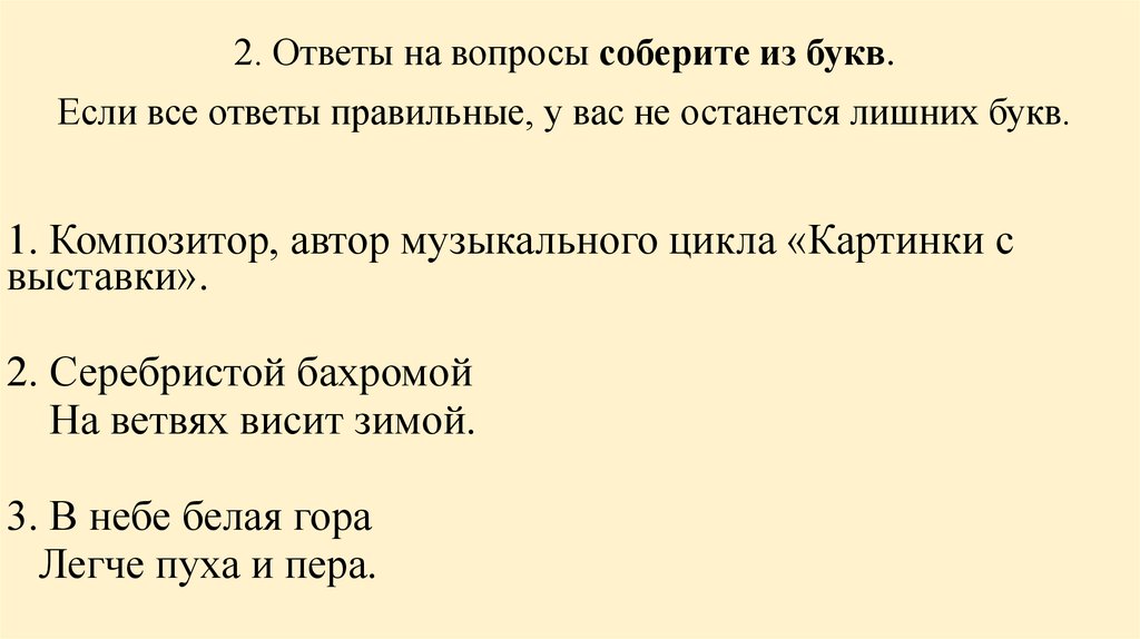 2. Ответы на вопросы соберите из букв.Если все ответы правильные, у вас не останется лишних букв.