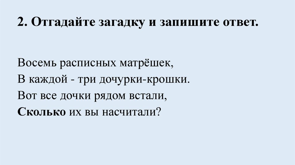 2. Отгадайте загадку и запишите ответ.Восемь расписных матрёшек,