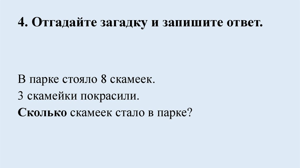 4. Отгадайте загадку и запишите ответ.В парке стояло 8 скамеек.