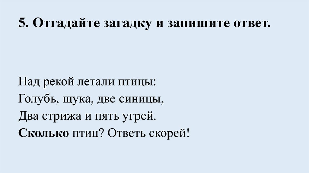 5. Отгадайте загадку и запишите ответ.Над рекой летали птицы: