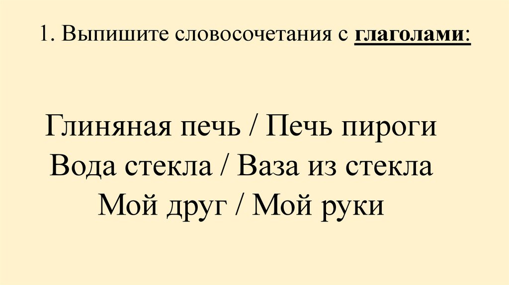 1. Выпишите словосочетания с глаголами:Глиняная печь / Печь пироги