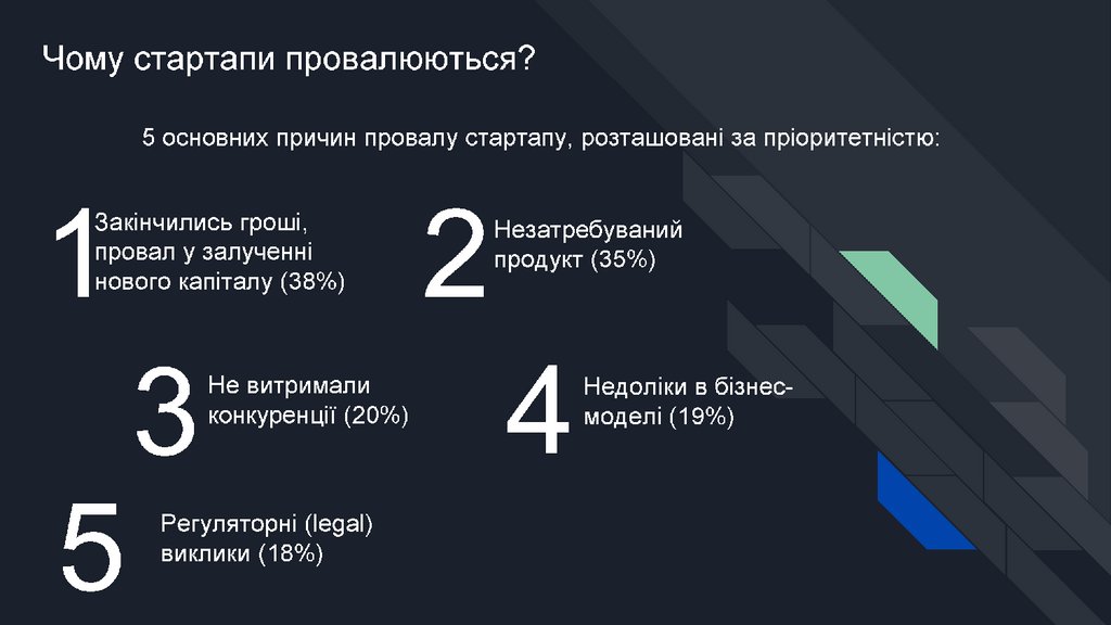 Чому стартапи провалюються?5 основних причин провалу стартапу, розташованг за прюритетнстю: