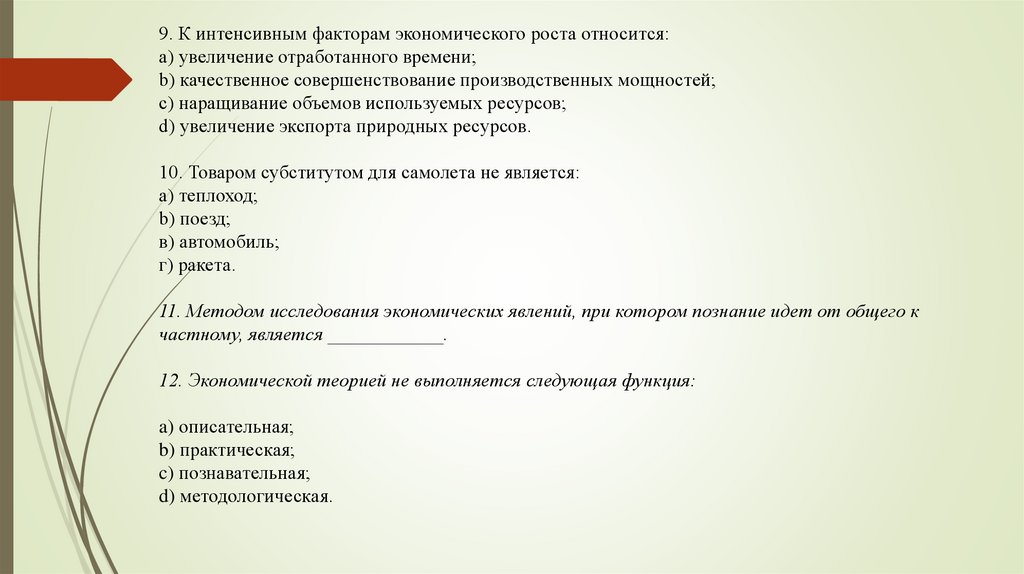 9. К интенсивным факторам экономического роста относится:a) увеличение отработанного времени;