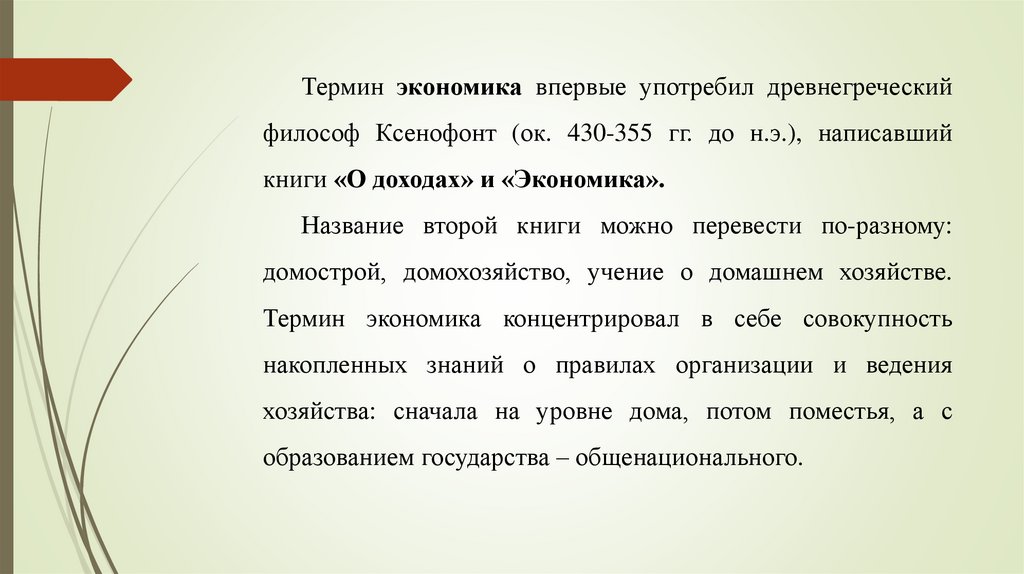 Термин экономика впервые употребил древнегреческийфилософ Ксенофонт (ок. 430-355 гг. до н.э.), написавший