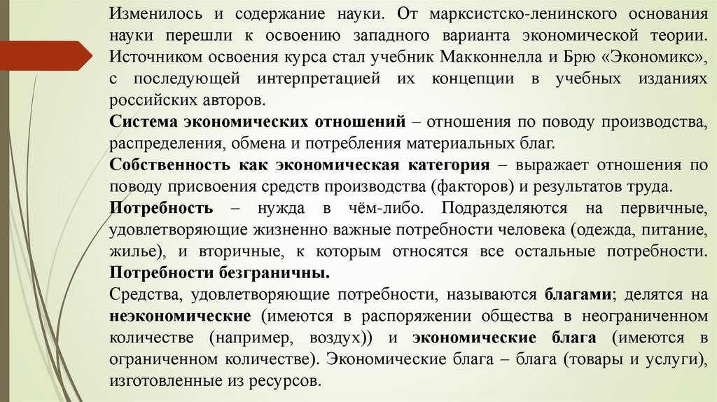 Изменилось и содержание науки. От марксистско-ленинского основаниянауки перешли к освоению западного варианта экономической теории.