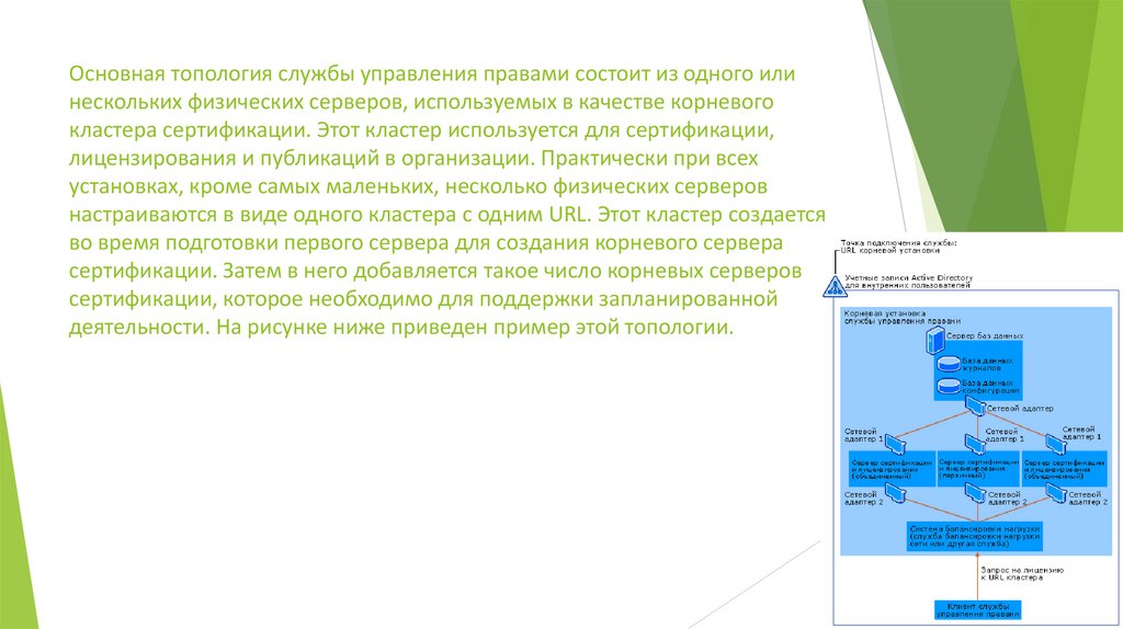 Основная топология службы управления правами состоит из одного илинескольких физических серверов, используемых в качестве корневого