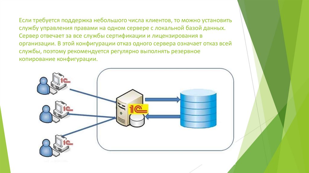 Если требуется поддержка небольшого числа клиентов, то можно установитьслужбу управления правами на одном сервере с локальной базой данных.
