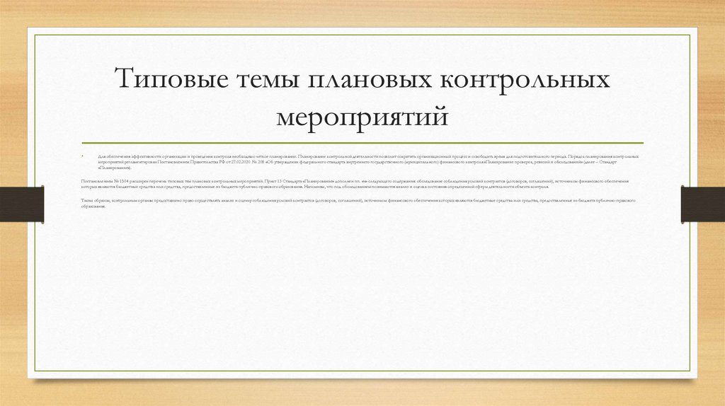Постановлением № 1504 расширен перечень типовых тем плановых контрольных мероприятий. Пункт 13 Стандарта «Планирование» дополнен пп. «ч» следующего содержания: обследование соблюдения условий контрактов (договоров, соглашений), источником финансового обеспечения