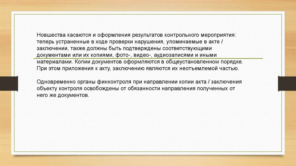Новшества касаются и оформления результатов контрольного мероприятия:теперь устраненные в ходе проверки нарушения, упоминаемые в акте /