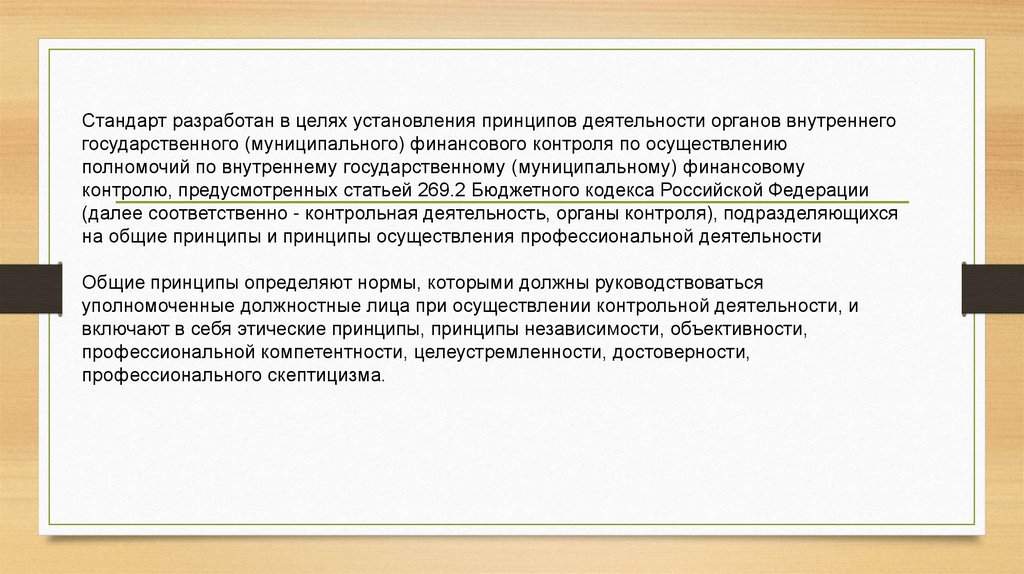 Стандарт разработан в целях установления принципов деятельности органов внутреннегогосударственного (муниципального) финансового контроля по осуществлению