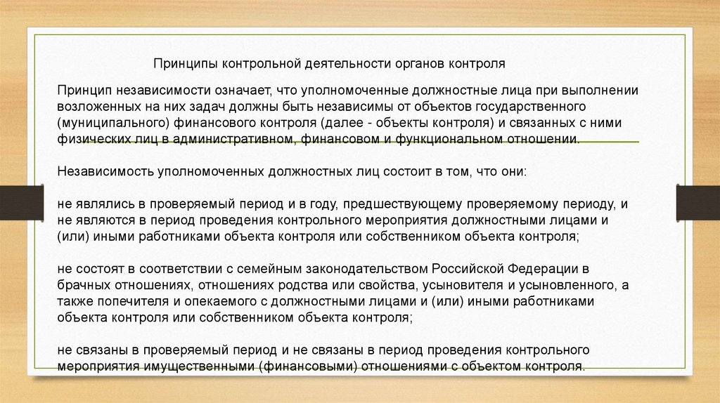 Принципы контрольной деятельности органов контроляПринцип независимости означает, что уполномоченные должностные лица при выполнении