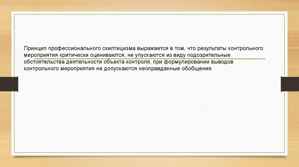 Принцип профессионального скептицизма выражается в том, что результаты контрольногомероприятия критически оцениваются, не упускаются из виду подозрительные
