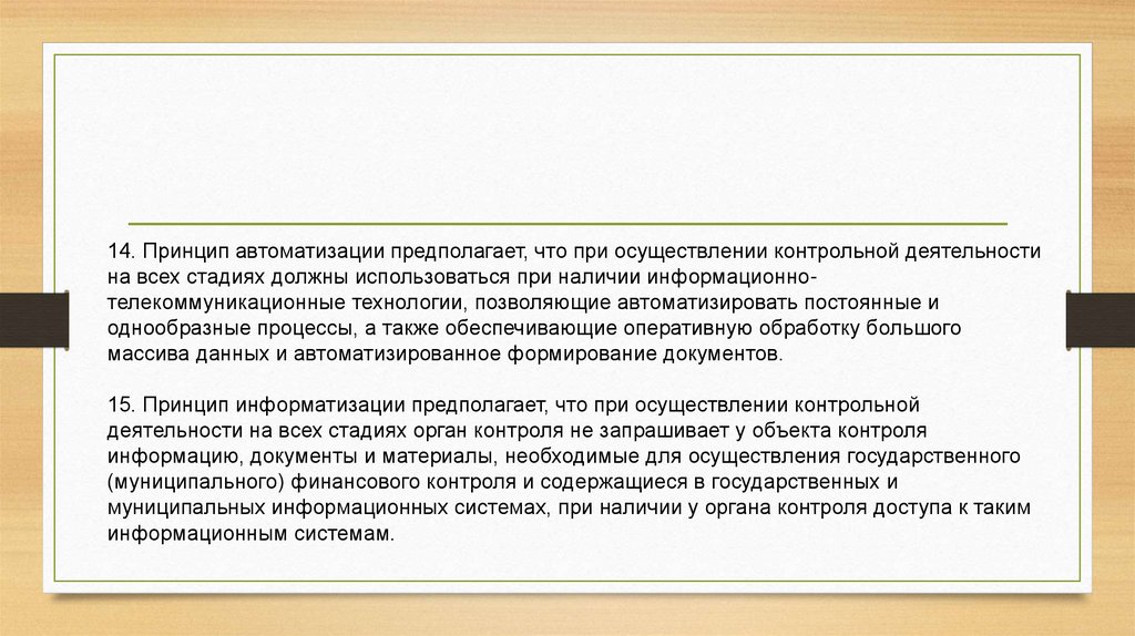 14. Принцип автоматизации предполагает, что при осуществлении контрольной деятельностина всех стадиях должны использоваться при наличии информационнотелекоммуникационные технологии, позволяющие автоматизировать постоянные и