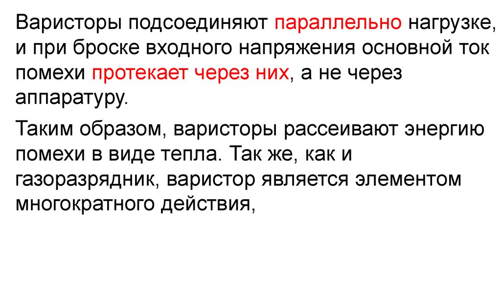 Варисторы подсоединяют параллельно нагрузке,и при броске входного напряжения основной ток