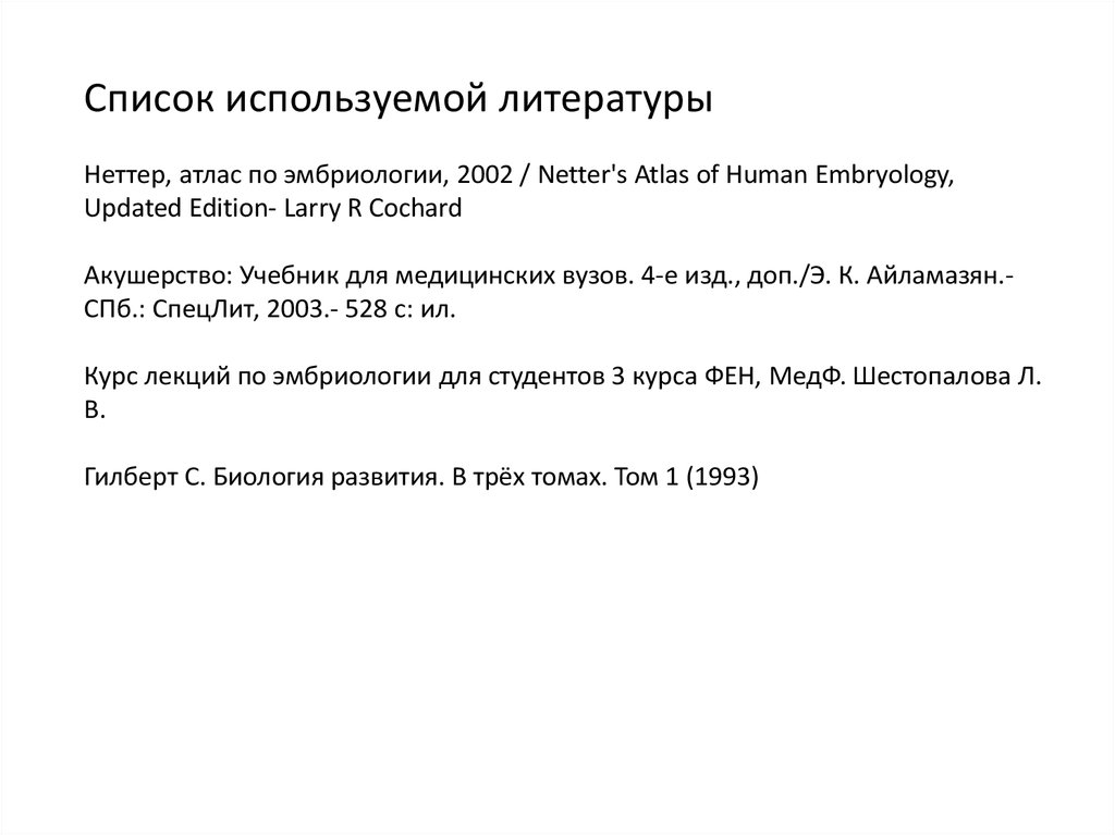 Список используемой литературыНеттер, атлас по эмбриологии, 2002 / Netter's Atlas of Human Embryology,