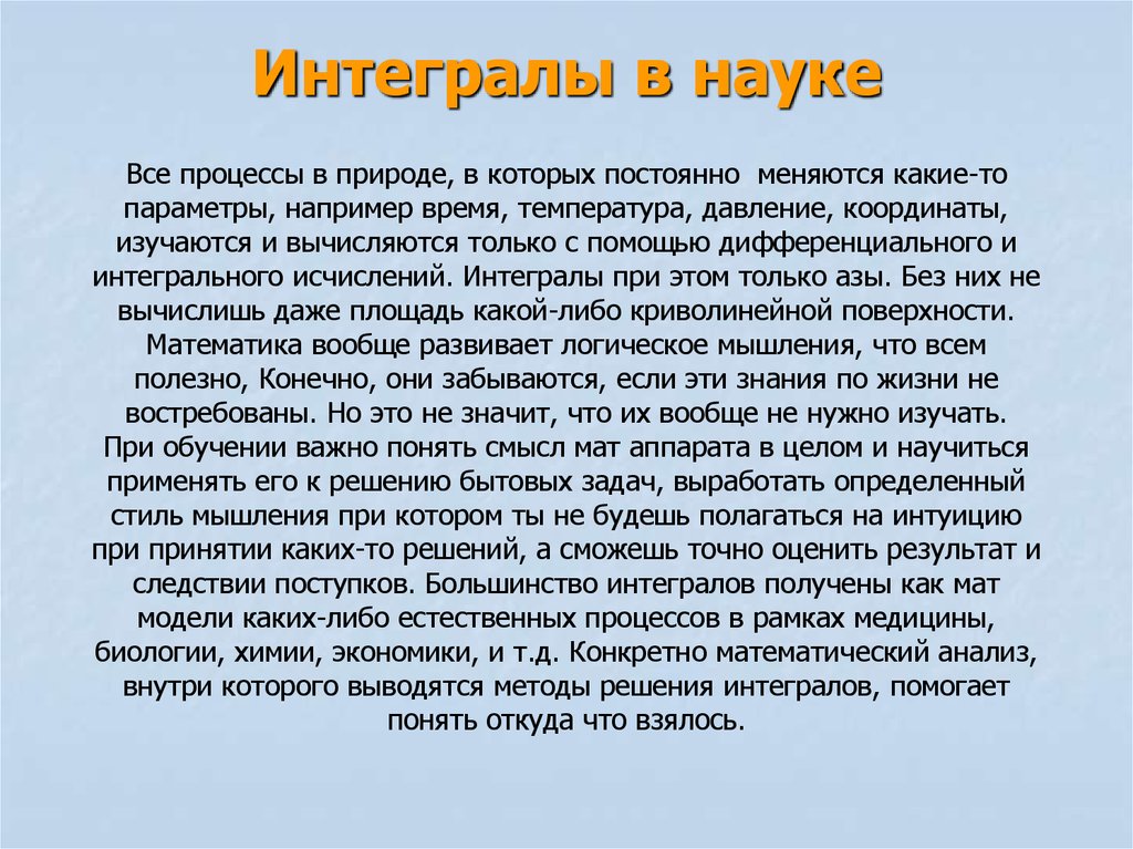 Интегралы в наукеВсе процессы в природе, в которых постоянно меняются какие-то
