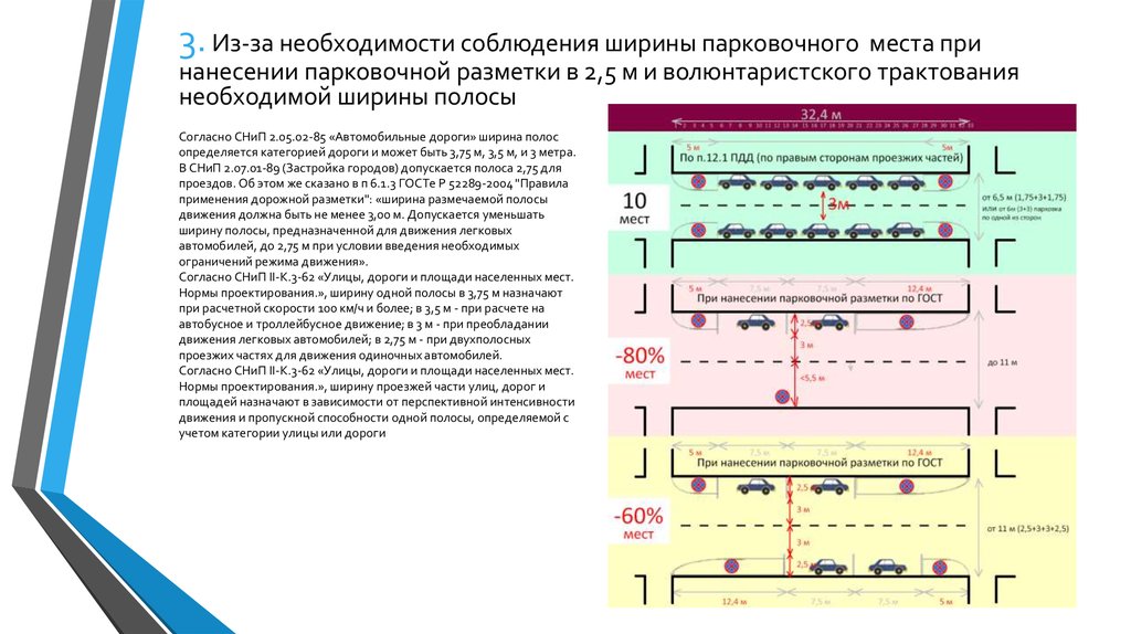 3. Из-за необходимости соблюдения ширины парковочного места принанесении парковочной разметки в 2,5 м и волюнтаристского трактования