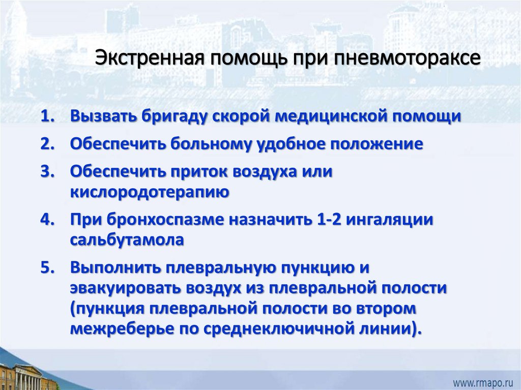 Экстренная помощь при пневмотораксе1. Вызвать бригаду скорой медицинской помощи