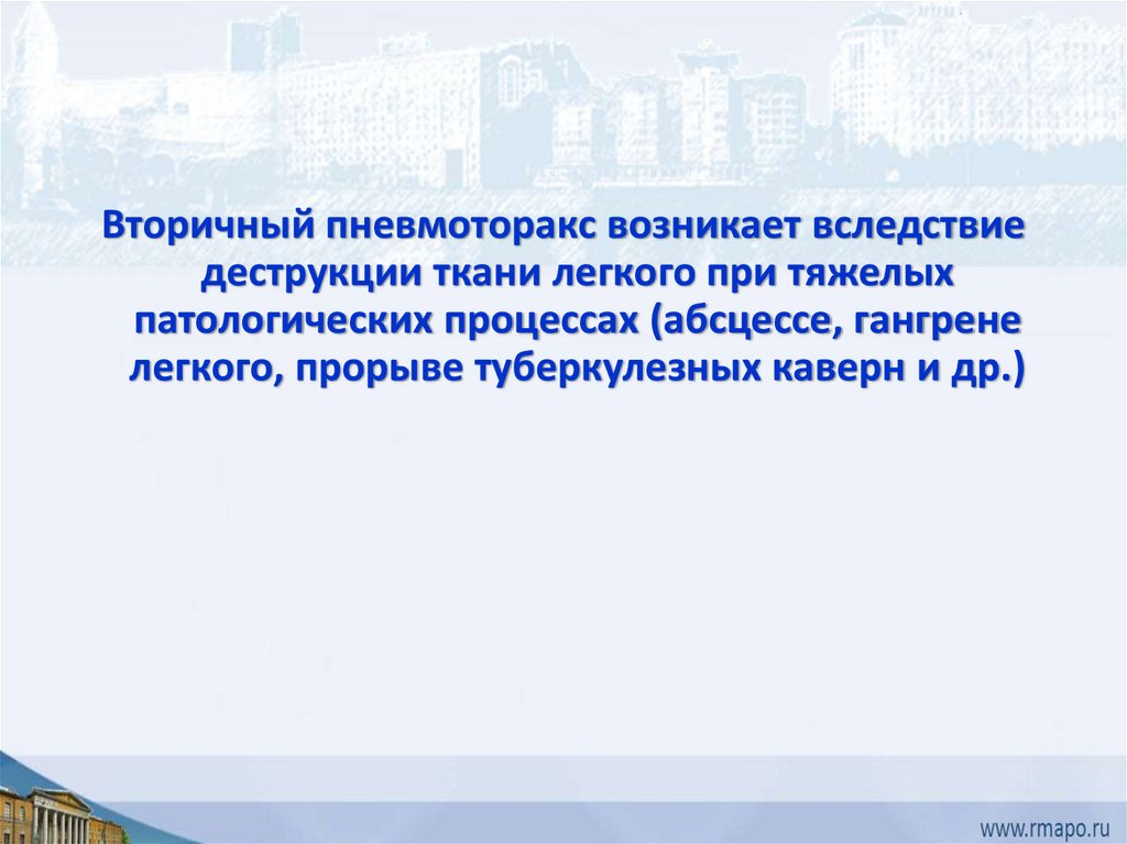 Вторичный пневмоторакс возникает вследствиедеструкции ткани легкого при тяжелых
