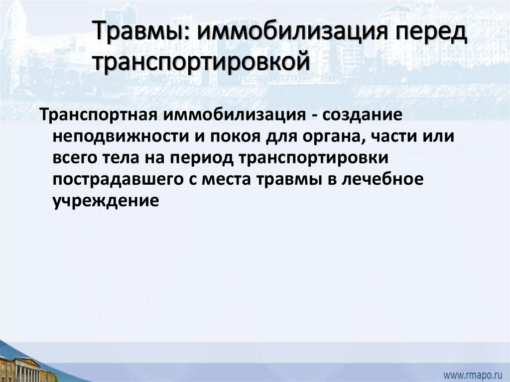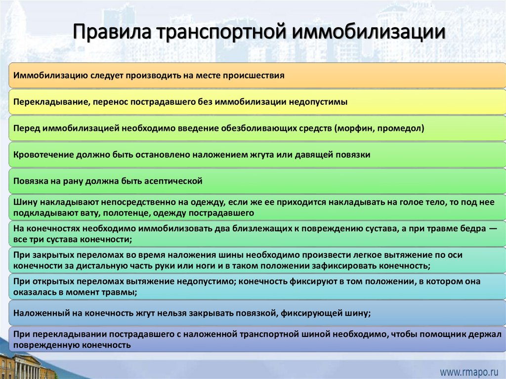 Правила транспортной иммобилизацииИммобилизацию следует производить на месте происшествия