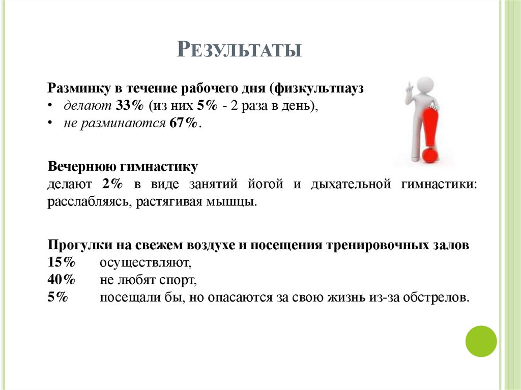 РЕЗУЛЬТАТЫРазминку в течение рабочего дня (физкультпаузу)