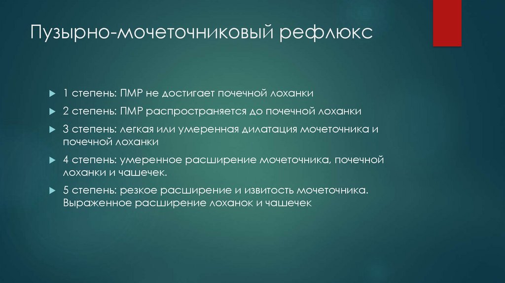 Пузырно-мочеточниковый рефлюкс1 степень: ПМР не достигает почечной лоханки